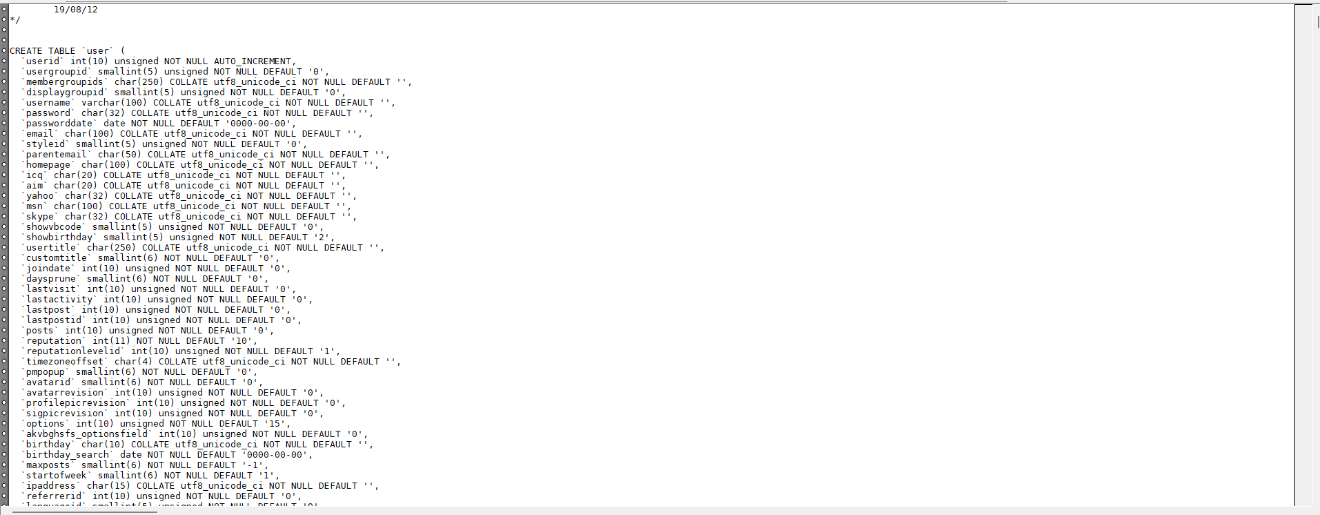 `membergroupids` char(250) COLLATE utf8_unicode_ci NOT NULL DEFAULT '',