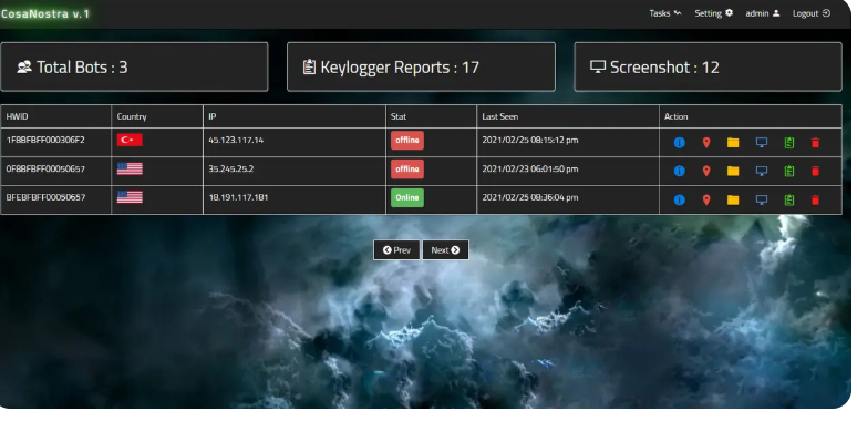 • Home Page: Displays all bots, counters for keylogger reports and screenshots, and details like HWID, country IP, online/offline status, and last seen.