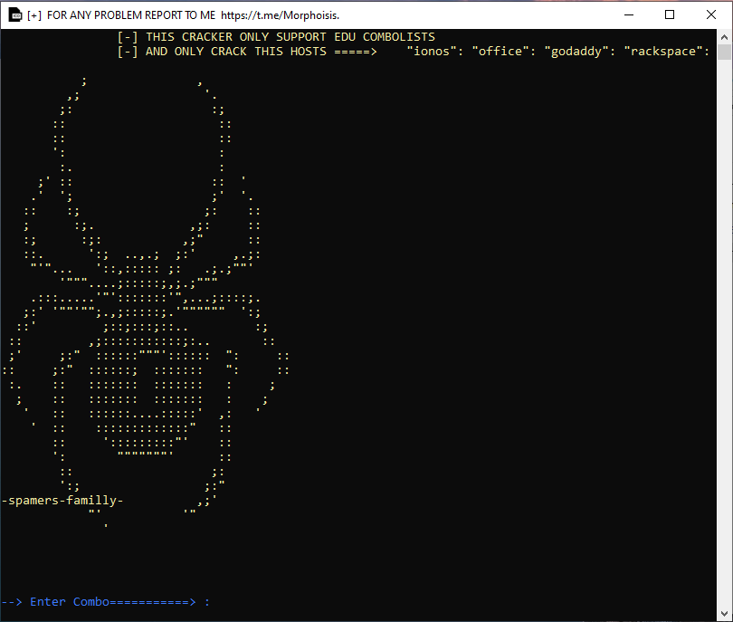 SMTP Advanced Cracker is a powerful and focused tool tailored for users working with EDU email combinations and select supported hosts. With compatibility for Ionos, Office, GoDaddy, Rackspace, and more, this tool provides an efficient way to test and crack email configurations. The visually captivating spider ASCII design adds a distinct aesthetic to this functional utility.