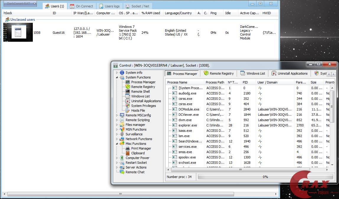 DarkComet allows a user to control the system with a graphical user interface. It has many features which allows a user to use it as administrative remote help tool; however, DarkComet has many features which can be used maliciously. DarkComet is commonly used to spy on the victims by taking screen captures, key-logging, or password stealing.